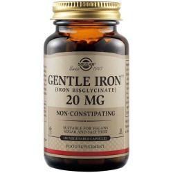 Το Solgar Gentle Iron περιέχει σίδηρο σε μορφή ferrous bisglycinate (20 mg ανά κάψουλα), έναν chelat..