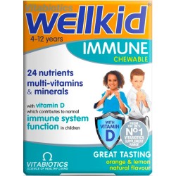 Το συμπλήρωμα διατροφής Wellkid της Vitabiotics περιλαμβάνει μασώμενες ταμπλέτες που έχουν σχεδιαστεί ειδικά για παιδιά στην ανάπτυξη, ηλικίας 4-12 ετών. Κάθε ταμπλέτα παρέχει εύρος 21 απαραίτητων συστατικών, όπως βιταμινών Α, B, C, D, E και σημαντικών μετάλλων όπως μαγνήσιο, σίδηρο και ψευδάργυρο, σε περιεκτικότητες κατάλληλες για παιδιά. Επιπλέον, περιέχει φυσική πηγή ωμέγα-3 λιπαρών οξέων από λιναρόσπορο. Ο συνδυασμός των βιταμινών Α, C, D και Ε, του συμπλέγματος βιταμινών Β και μέταλλων όπως το σελήνιο, μπορεί να βοηθήσει στη διατήρηση της σωστής ανάπτυξης του παιδιού, να ενισχύσει το ανοσοποιητικό του σύστημα και να προάγει την απελευθέρωση ενέργειας.